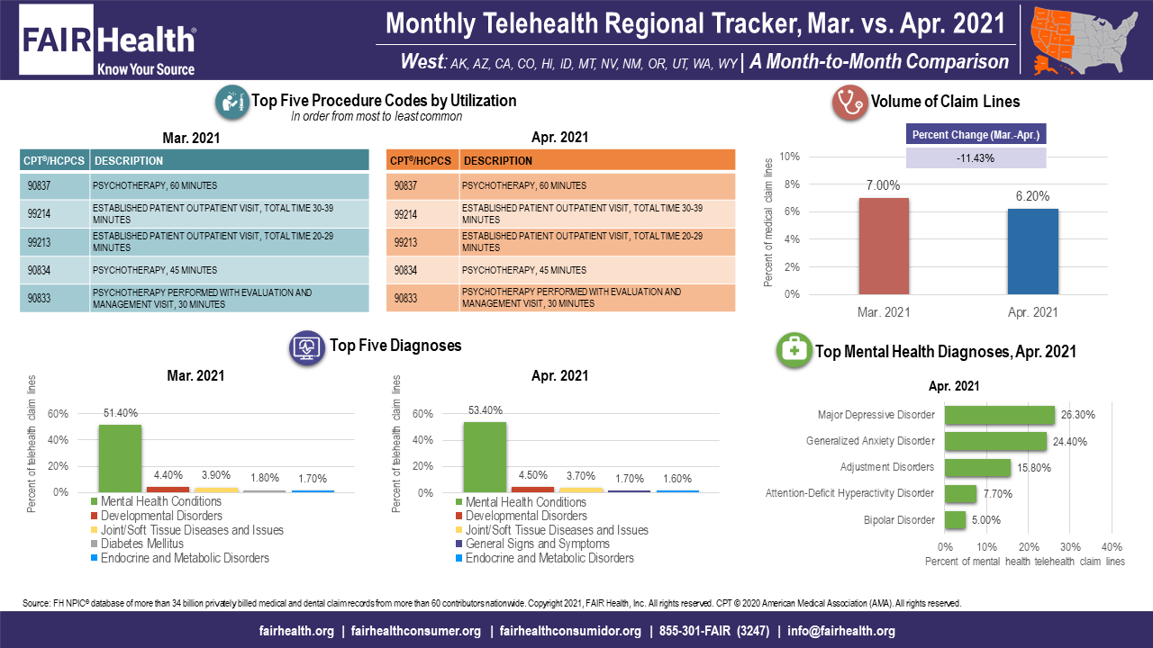 Launched in May 2020 as a free service, the Monthly Telehealth Regional Tracker uses FAIR Health data to track how telehealth is evolving from month to month. An interactive map of the four US census regions allows the user to view an infographic on telehealth in a specific month in the nation as a whole or in individual regions. Each infographic shows month-to-month changes in volume of telehealth claim lines, top five telehealth procedure codes, top five telehealth diagnoses (or diagnostic categories) and top five granular diagnoses within the most common diagnostic category.