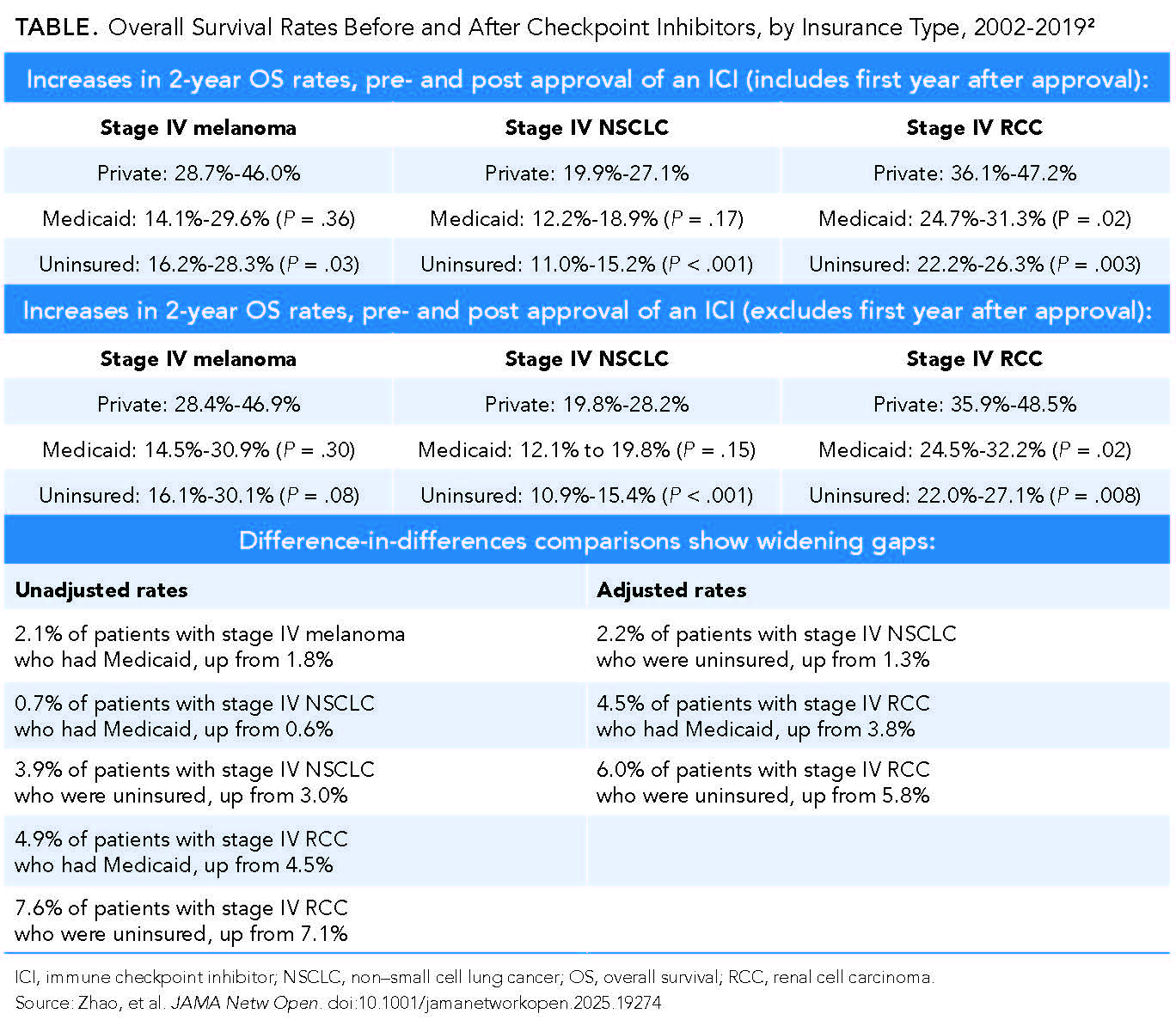 Although intended to improve outcomes for patients living with 1 of 3 stage IV cancer types—melanoma, non–small cell lung cancer (NSCLC), or renal cell carcinoma (RCC)—immune checkpoint inhibitors (ICIs) may not confer equivalent survival benefits among individuals who have 1 of 2 insurance types—private insurance or Medicaid—or are uninsured. New cross-sectional study results paint a picture of widening survival disparities, favoring patients who have private insurance over those who are not insured.