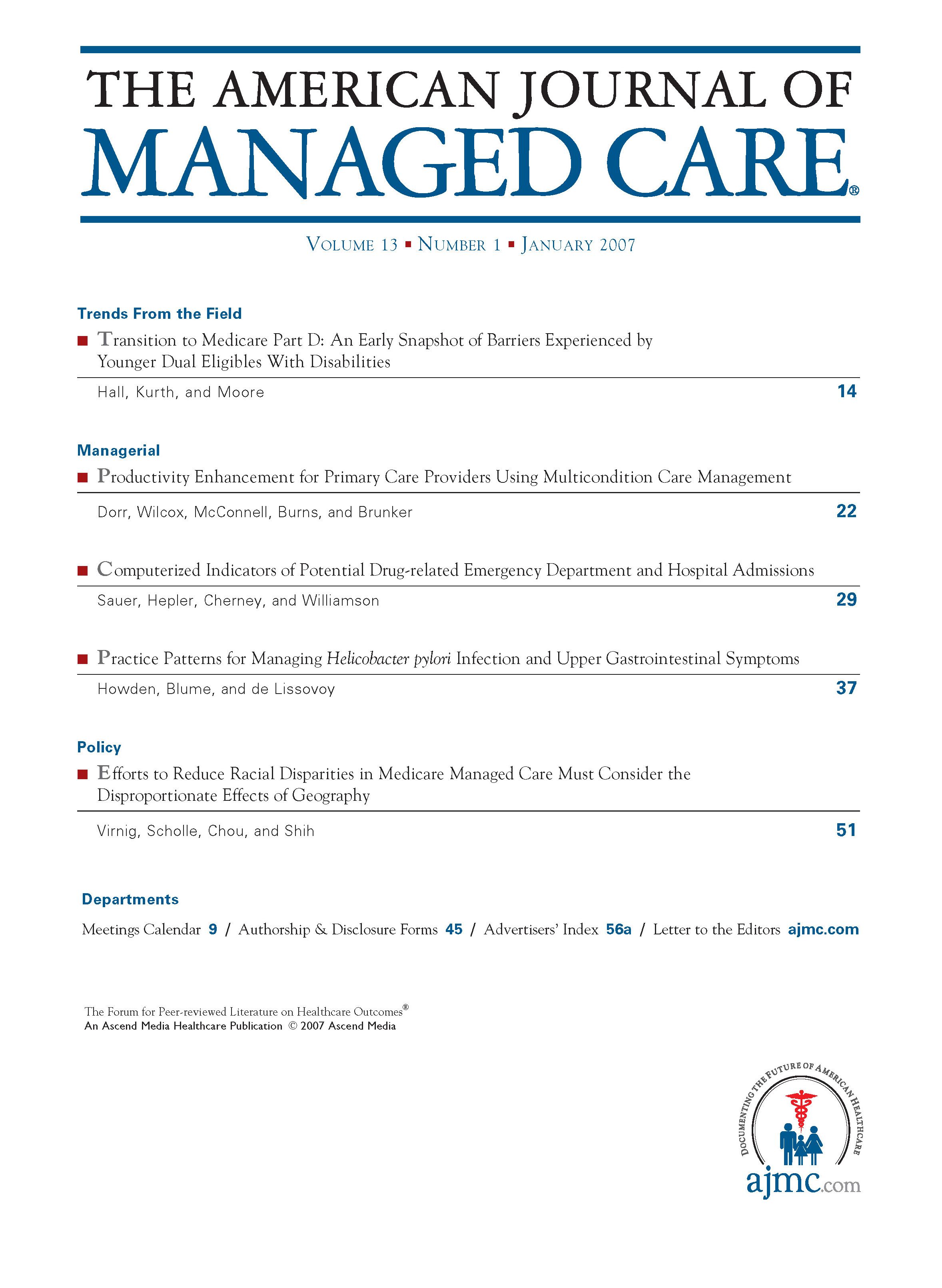 An alternative to disease management programs is care management in the form of the chronic care model. The chronic care model is a multistep program that creates a clinical care team in ambulatory settings, which has shown significant improvements in process and intermediate outcomes in a number of chronic conditions.7 However, adoption of primary care-focused care management systems has been slow. In part, this is because of incentive structures within the reimbursement system.4 Whereas health plans or employers can reap the benefits of reducing costs for their sickest patients, physician groups that incur the costs of implementing and operating programs often do not receive the associated savings of such an investment. For example, a physician's office with a robust program may generate less revenue because healthier patients need less care.8