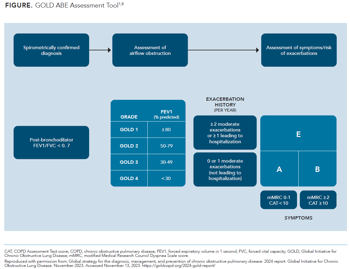 According to the GOLD 2023 and 2024 reports, COPD diagnosis is confirmed by spirometric measurement of airflow limitation that is not fully reversible (ie, FEV1:FVC ratio < 0.7 postbronchodilation).1,8 However, limited access to spirometers and limited proficiency with spirometric testing contributes to underdiagnosis of COPD, particularly in primary care.1,4 In a retrospective study of Veterans Affairs Corporate Data Warehouse administrative data for 24,300 patients newly diagnosed with COPD between January 2012 and December 2015 who received primary care in a Veterans Administration facility with advanced specialized services, only 59.7% were given confirmatory spirometry results in the 2 years following initial COPD diagnosis. Patients who did not have a visit with a pulmonary specialist were less likely to undergo spirometry (adjusted odds ratio [aOR], 0.38; 95% CI, 0.35-0.41).23