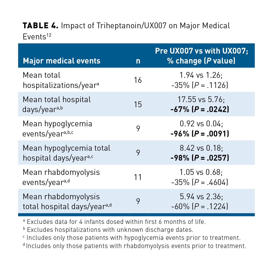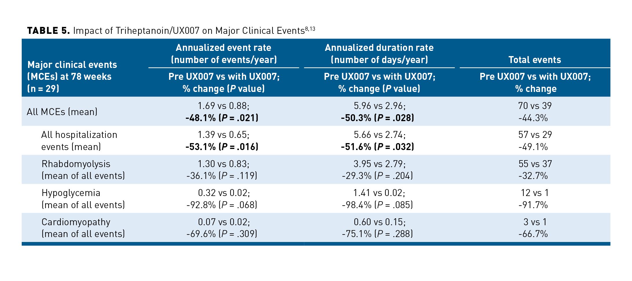 Results of a study for FDA registration of triheptanoin have also been published. This study was a single-arm, open-label, multicenter phase 2 safety and efficacy study evaluating patients with severe LC-FAOD evidenced by ongoing related musculoskeletal, cardiac, and/or hepatic events despite treatment; end points were at 24 and 78 weeks. Patients acted as their own control. After a 4-week run-in on current therapy, triheptanoin was titrated to a target dose of 25% to 35% of total daily caloric intake. The incidence of and hospitalizations related to hypoglycemia, cardiomyopathy, and rhabdomyolysis were captured and compared with the year prior to starting in the study. Patients also were evaluated on several age/condition-eligible end points, including submaximal exercise tests to assess muscle function/endurance 12-minute walk test (12MWT), exercise tolerance (cycle ergometry), and health-related quality of life (HRQOL). Twenty-nine patients (0.8-58 years) were enrolled; most qualified based on severe musculoskeletal disease. Twenty-five patients (86%) completed the 24-week treatment period. At week 18, eligible patients (n = 8) demonstrated a 28% increase (LS mean = +181.9 meters; P = .087) from baseline (673.4 meters) in 12MWT distance. At week 24, eligible patients (n = 7) showed a 60% increase in watts (W) generated (LS mean = +409.3W; P = .149) over baseline (744.6W) for the exercise tolerance test. Improvements in exercise tests were supported by significant improvements from baseline in the adult (n = 5) self-reported SF-12v2 physical component summary score (LS mean = +8.9; P <.001). In patients with severe LC-FAOD, triheptanoin interim study results revealed enhanced exercise endurance and tolerance and was linked with positive changes in self-reported HRQOL.9 At 78 weeks, there was a demonstrated persistent reduction of the incidence of major clinical events and related hospital days related to rhabdomyolysis, hypoglycemia, and cardiomyopathy. The composite end points of annualized event rate and annualized duration rate for all events were significantly reduced as noted in Table 5.8,13 The majority of AEs over both studies were mild to moderate gastrointestinal symptoms, including diarrhea (44%), vomiting (44%), nausea (14%), and abdominal pain (including abdominal discomfort, abdominal distention, upper abdominal pain, and gastrointestinal pain (60%). AEs led to dose reductions in 35% of patients in the first study and 12% of patients in the extension study. AEs were often managed with smaller, frequent doses mixed with food.8,24