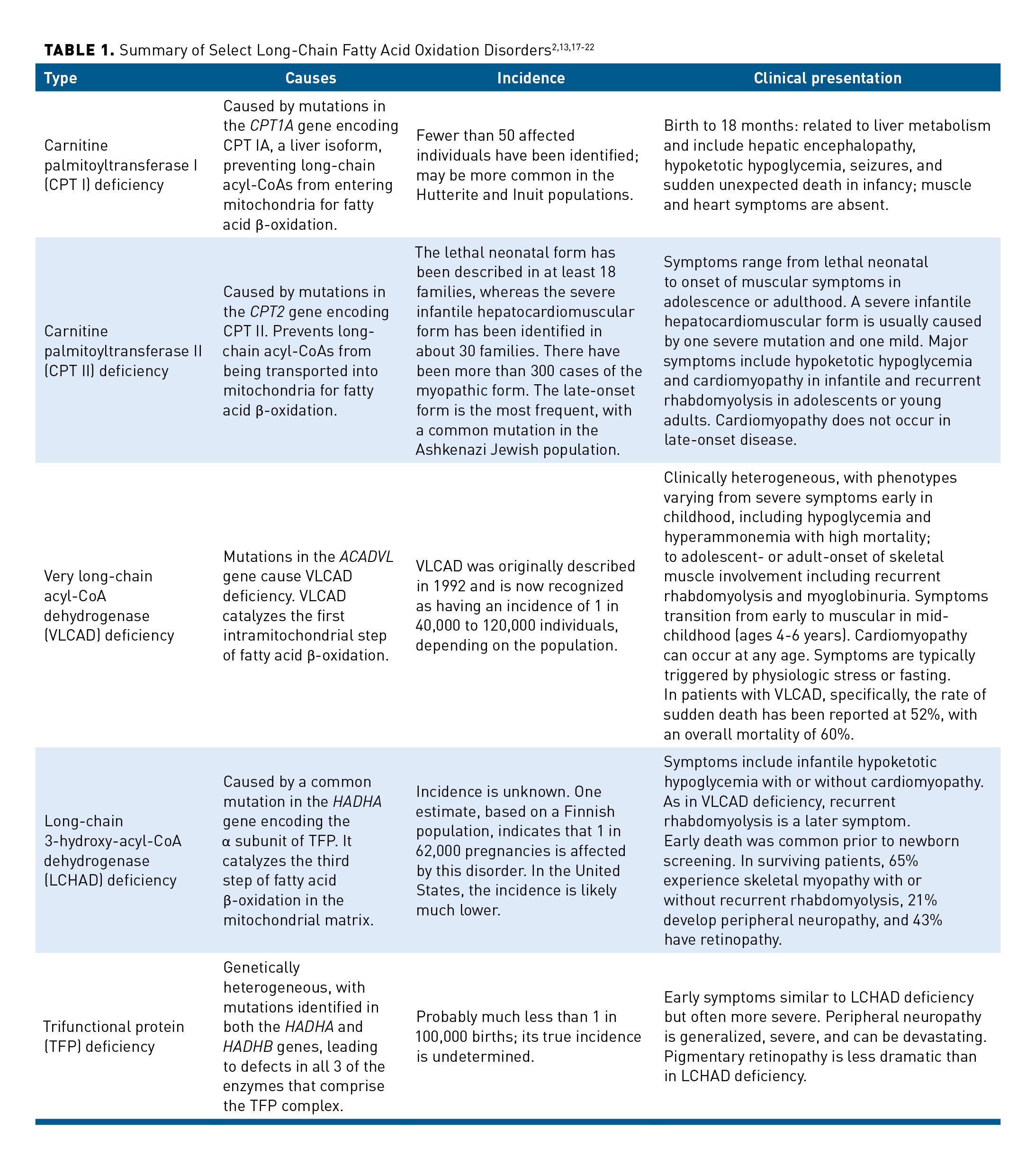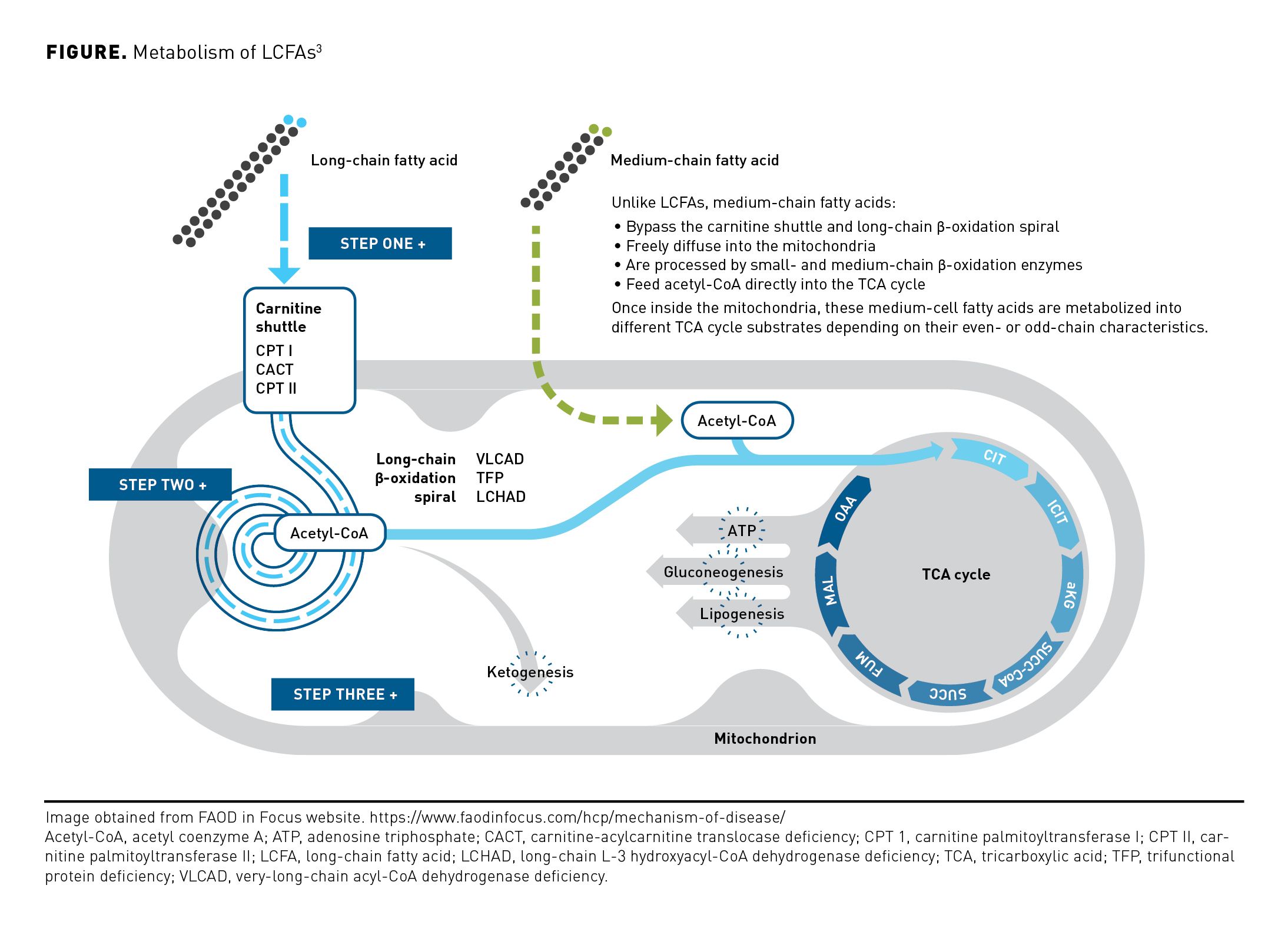 Fatty acid oxidation disorders (FAODs) are a group of more than 20 life-threatening, inborn errors of metabolism caused by either disruption of entry of fatty acid substrates into mitochondria or a defect in their β-oxidation in the mitochondrial matrix.10,11 They are inherited as autosomal recessive conditions. Historically, they have been shown to lead to significant morbidity and mortality.9 Fatty acid oxidation (FAO) is characterized as long and medium, based on the α-carbon chain length of fatty acyl-CoA substrates. Long-chain fatty acid oxidation disorders (LC-FAODs) affect the metabolism of fats of greater than 8-12 carbons and are caused by deficiencies of 1 of 3 enzymes/carriers responsible for entry of long-chain fats into mitochondria (the carnitine cycle) or 4 steps of the mitochondrial β-oxidation spiral in the mitochondrial matrix. The end result is a deficit of reducing equivalents for mitochondrial oxidative phosphorylation. Symptoms in patients with LC-FAODs are driven by acute crises of energy production and chronic energy deficiency.8,12,13 In LC-FAODs, the oxidation of fatty acids is disrupted by deficiencies in crucial mitochondrial enzymes, which in turn compromises energy homeostasis and sparks a buildup of potentially toxic fatty acid intermediates.4 Partial or incomplete oxidation of fatty acids leads to accumulation of elevated concentrations of metabolite intermediates in blood and organs as well as systemic effects, such as hypoglycemia, hyperammonemia, and acidosis.14 Common symptoms include cardiomyopathy and recurrent rhabdomyolysis.