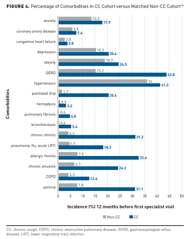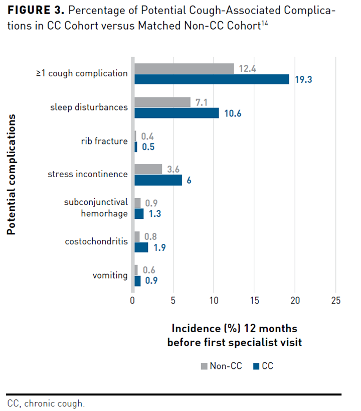 In addition to the negative effects on WPAI, presenteeism, absenteeism, and patient and family QOL, people with CC also have an increased burden of CC-related complications and comorbidities. A KPSC cross-sectional, observational study compared the incidence of comorbidities and complications of participants with CC (n = 10,926) with a matched control group (n = 10,926) 12 months before an initial specialist visit. Potential cough-associated complications occurred in 19.3% of participants in the CC group versus the non-CC group (12.4%; P <.001). Patients with CC experienced more sleep disturbances (P <.001), stress incontinence (P <.001), costochondritis (P <.001), subconjunctival hemorrhage (P = .007), vomiting (P = .002), rib fracture (P = .148), and 1 or more potential cough complications (P <.001) than did patients without CC (Figure 314). Respiratory comorbidities occurring more often in the CC group vs the non-CC group (all P <.001) included asthma, COPD, chronic sinusitis, allergic rhinitis, pneumonia, influenza, acute lower respiratory tract infections, chronic rhinitis, bronchiectasis, pulmonary fibrosis, hemoptysis, and postnasal drip (Figure 414). Patients in the CC group experienced nonrespiratory disorders more frequently than those without CC (all P <.001), including hypertension, GERD, obesity, depression, congestive heart failure, coronary artery disease, and anxiety.14