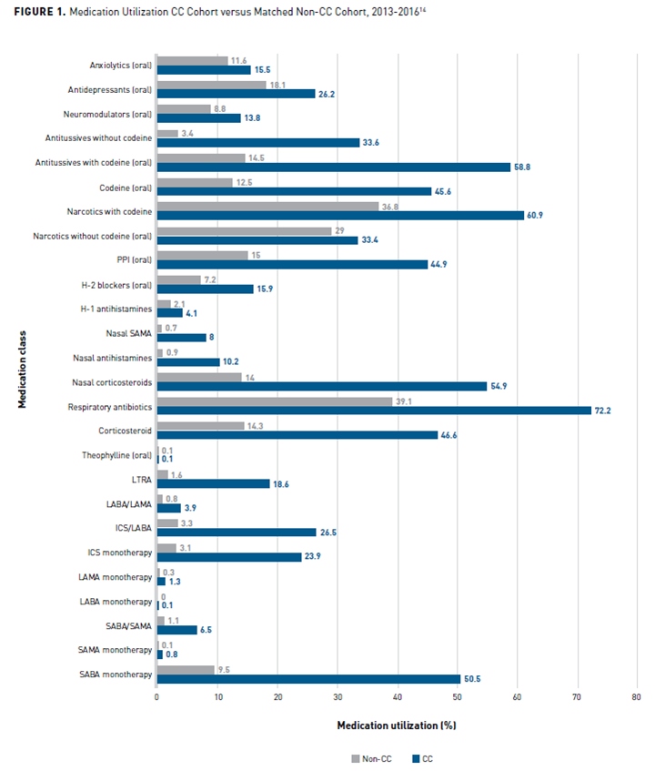 A cross-sectional, observational study compared medication and healthcare utilization of 10,926 participants aged 18 to 85 years at 1 year before their first outpatient visit to a CC specialist (index date) with a matched control group in the Kaiser Permanente Southern California (KPSC) Research Data Warehouse from 2013 to 2016. The patients were identified with a KPSC-specific CC encounter code. The study included participants who did not have an angiotensin-converting enzyme inhibitor dispensed in the year before the index date. The patients with CC had significantly (P <.001 for all) more medications for asthma, chronic obstructive pulmonary disease (COPD), rhinitis, gastroesophageal reflux disease (GERD), narcotic and non-narcotic antitussives, and other drugs to treat cough than the control group, except for theophylline (P = .074) and long-acting β-agonist monotherapy (P = .096) (see Figure 114). Healthcare utilization for respiratory-specific causes was significantly (all P <.001) greater for participants with CC than in the control group for outpatient visits (83.8% vs 26.8%), 1 or more emergency department visits (12.9% vs 5.0%), and 1 or more hospitalizations (5.6% vs 2.9%). Participants with CC consulted significantly (all P <.001) more specialists than the matched groups without CC (≥2 visits: 39.6% vs 5.7%; ≥3 visits: 11.0% vs 0.8%; ≥4 visits: 2.2% vs 0.1%). Laboratory testing was also significantly greater (all P <.001) in patients with CC than in participants in the control groups, including imaging such as chest x-ray, chest computed tomography (CT)/magnetic resonance imaging/ultrasound; gastrointestinal testing including esophageal pH studies/manometry, barium swallow or upper gastrointestinal, and esophageal endoscopy; respiratory tests including methacholine challenge, spirometry, bronchoscopy, laryngoscopy, sinus x-ray/CT, and nasal/sinus endoscopy; and allergy testing.14