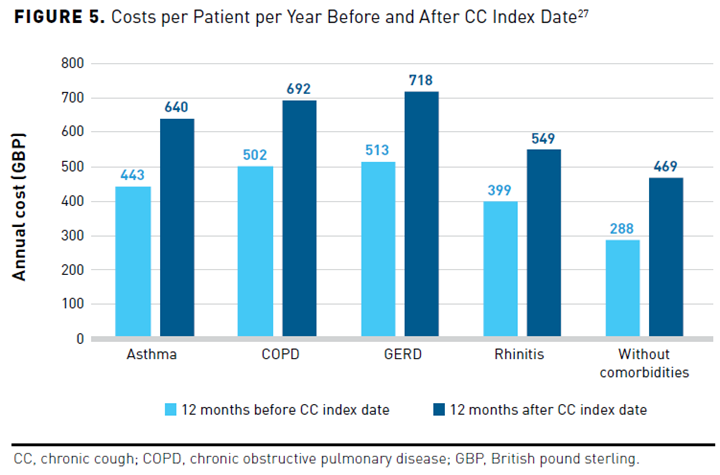 A cross-sectional, retrospective study in the United Kingdom examined the annual estimated outpatient treatment costs related to CC alone versus CC with comorbid conditions. The study identified 43,453 participants aged 18 years and older with CC using ICD-10 codes and prescription claims data from the Discover dataset between January 1, 2015, and September 30, 2019. The study determined costs related to asthma, COPD, GERD, and rhinitis for 12 months before and after the index date, which was defined as 2 or more documented cough-related consultations for symptoms persisting at least 8 weeks. Overall, 68% of study participants had at least 1 CC-related comorbidity. Annual costs per patient were higher in patients with CC and a comorbidity than in those without (Figure 527). Patients with CC and GERD incurred the greatest costs, followed by CC and COPD, then CC and asthma, and lastly CC and rhinitis. The total annual outpatient costs per patient increased 31% for those with CC and asthma (n = 8834), 27% for those with CC and COPD (n = 6105), 29% for those with CC and GERD (n = 5217), and 27% for those with CC and rhinitis (n = 3685) from 12 months before and after the index date.27
