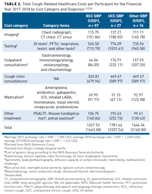 Studies conducted in other countries have assessed the economic burden of CC.10,11,18 Although the cost analyses of these studies may not directly translate to healthcare costs incurred for CC in the United States, they may provide some insight into the economic and clinical burden of patients with CC.22 A prospective study (N = 100) evaluated the healthcare utilization and cost in patients with CC seen at a specialist cough clinic at King’s College Hospital, London, United Kingdom, between 2016 and 2018. Researchers examined the effect of health status, objective cough frequency, cough severity, depression, and anxiety on measured costs. The study assessed health-related quality of life (HRQOL) using the 5-level EuroQol 5 dimension, cough-specific health status using the Leicester Cough Questionnaire (LCQ), 24-hour objective cough frequency using Leicester Cough Monitor, cough severity using visual analog scale, depression using Patient Health Questionnaire, and anxiety using Generalized Anxiety Disorder 7 (GAD7).The study estimated that the mean total cough-related healthcare cost for the 12 months before the cough clinic specialist visit was £645.73 GBP ($832.35 USD) per participant and £1017.12 GBP ($1357.75 USD) per participant for the 12 months after.23,24 Table 211,23,24 provides a breakdown of costs by category and diagnosis. Imaging, testing, and consultations accounted for most of the total cough-related healthcare costs; medication costs accounted for the least. Total costs for participants with unexplained CC (UCC) were significantly (P = .02) higher than those with RCC. After multivariate analysis, increased anxiety severity (GAD7) and poor cough-specific health status (LCQ) were associated with increased costs (P <.001 and P = .037, respectively).11