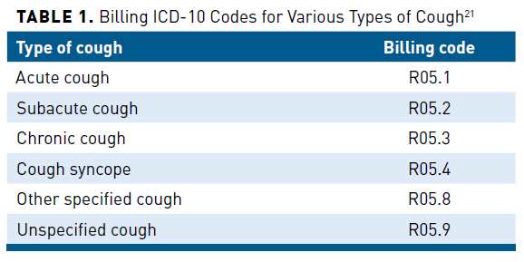 Studies have shown that CC is associated with substantial direct and indirect costs.10-19 In the United States, direct medical and pharmacy costs have been historically difficult to quantify based on administrative healthcare data due to the lack of specific International Classification of Diseases (ICD)-9 or ICD-10 diagnostic codes to distinguish patients with CC.20 Only as recently as October 1, 2021, have more specific billing ICD-10 codes become available to differentiate between types of cough, as shown in Table 1.21