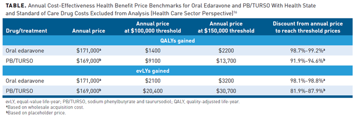 Use of prior authorizations: FDA labels should be a guide to coverage policy and should include the input of clinical experts and diverse patient representatives. Given the limited evidence and that the incremental cost-effectiveness exceeds typical cost-effective ratios for PB/TURSO and oral edaravone, prior authorizations are reasonable for payers to have on both therapies.