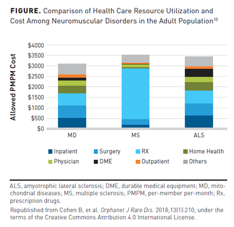 In a separate analysis evaluating the health care utilization of mitochondrial diseases, retrospective claims data were used from the Truven Health Analytics MarketScan Database and Milliman’s Consolidated Health Cost Guidelines Sources Database for the 2015 calendar year.10 Health care utilization for mitochondrial diseases was compared with that of ALS (n = 4579) and patients (n = 125,434) with multiple sclerosis. ALS was shown to have a per-member per-month (PMPM) cost burden of $3460, with most of the costs attributed to inpatient services, surgery claims, and prescription drug costs (Figure10). Inpatient visits were similar in mitochondrial diseases (27.8%) and ALS (20.9%) patient groups. Patients with multiple sclerosis were the least likely to use inpatient services (9.1%).10