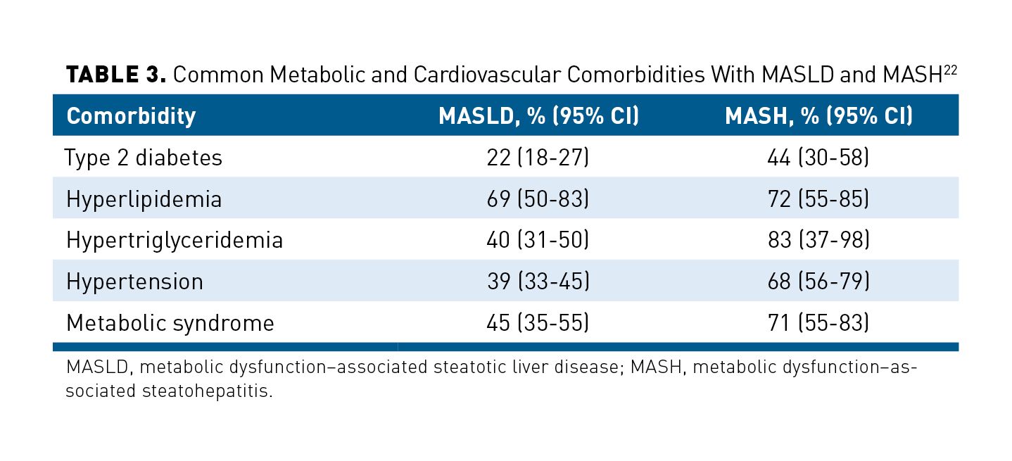 MASH is more common in patients with obesity and with T2D, but it can also occur in the absence of obesity and diabetes. Conversely, MASH is not present in all people with obesity and T2D. However, frequent comorbidities among people with MASLD and MASH include T2D, obesity, hyperlipidemia, hypertriglyceridemia, hypertension, and metabolic syndrome (Table 3).22 The most prevalent comorbidity in people with MASLD is hyperlipidemia (elevated cholesterol and/or triglyceride level).22 The most prevalent comorbidity among people with MASH is hypertriglyceridemia.22 Components of the metabolic syndrome generally were more prevalent among people with MASH than among those with MASLD.22