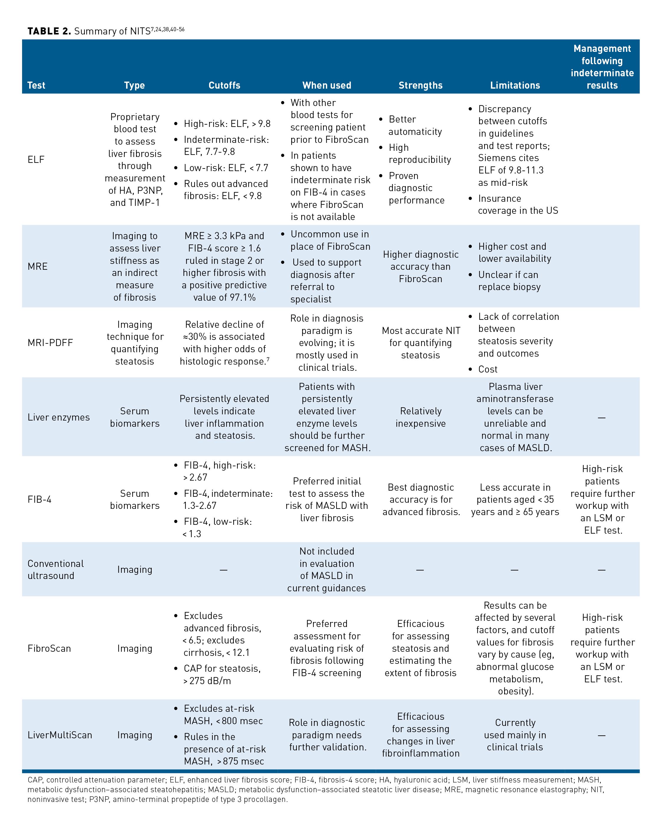 Liver biopsy is the classic tool used in the diagnosis of MASLD/MASH, although it has limited practicality in routine clinical care due to its invasive nature, associated risks, and reader variability.39 Accordingly, the current guidance extensively incorporates the use of NITs as markers for identification, determination of severity, monitoring, and establishment of prognosis of patients with MASLD/MASH (Table 2).7,24,38,40-56