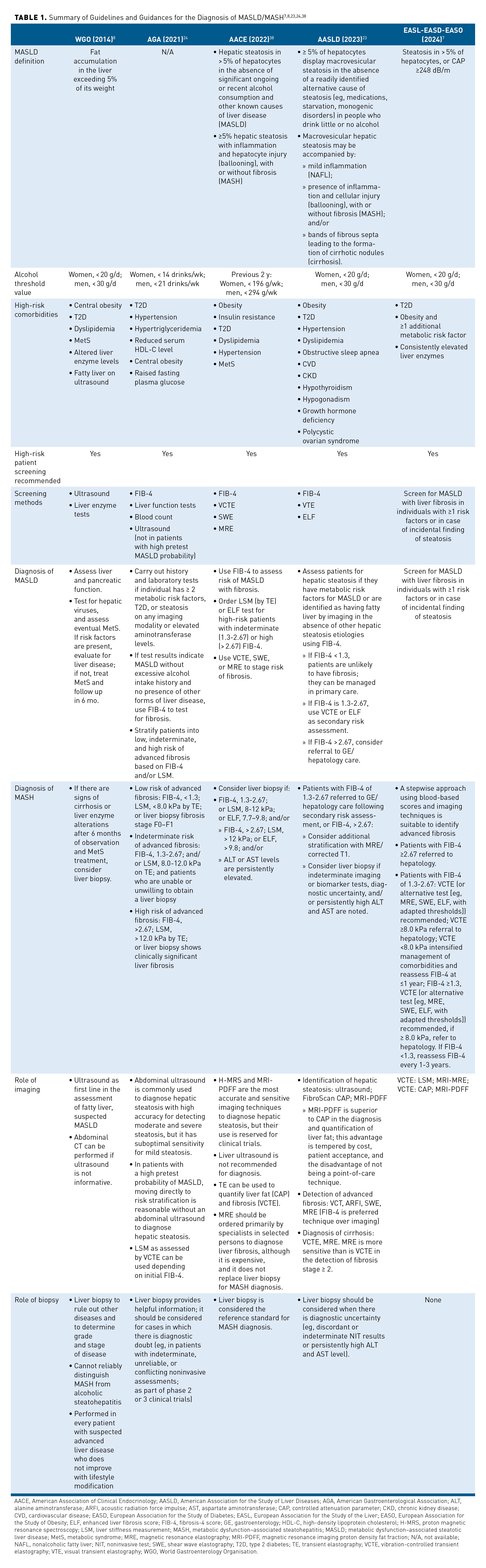 There are many guidelines/guidances available, and each differs somewhat from the others in its recommendations regarding screening for and diagnosis of MASH—there is no single or specific noninvasive approach that is commonly used. Further, the approaches used to develop the guidelines/guidances and the purposes of these documents may differ. For example, the AASLD guidance focuses on advances in MASLD with respect to noninvasive risk stratification and therapeutics; it is not a formal guideline in that it was not developed using a standardized framework, so the document provides actionable statements as opposed to formal recommendations.23 In contrast, the AACE guidance provides formal recommendations for the diagnosis and management of MASLD in endocrinology and primary care practices; it was developed using a standardized framework for practical evidence-based guidelines.38 The AGA Clinical Care Pathway, developed by a multidisciplinary panel of experts, focuses on the screening, diagnosis, and treatment of MASLD; it is intended to facilitate value-based, efficient, and safe care that is consistent with evidence-based guidelines in any setting in which management of MASLD is provided.24