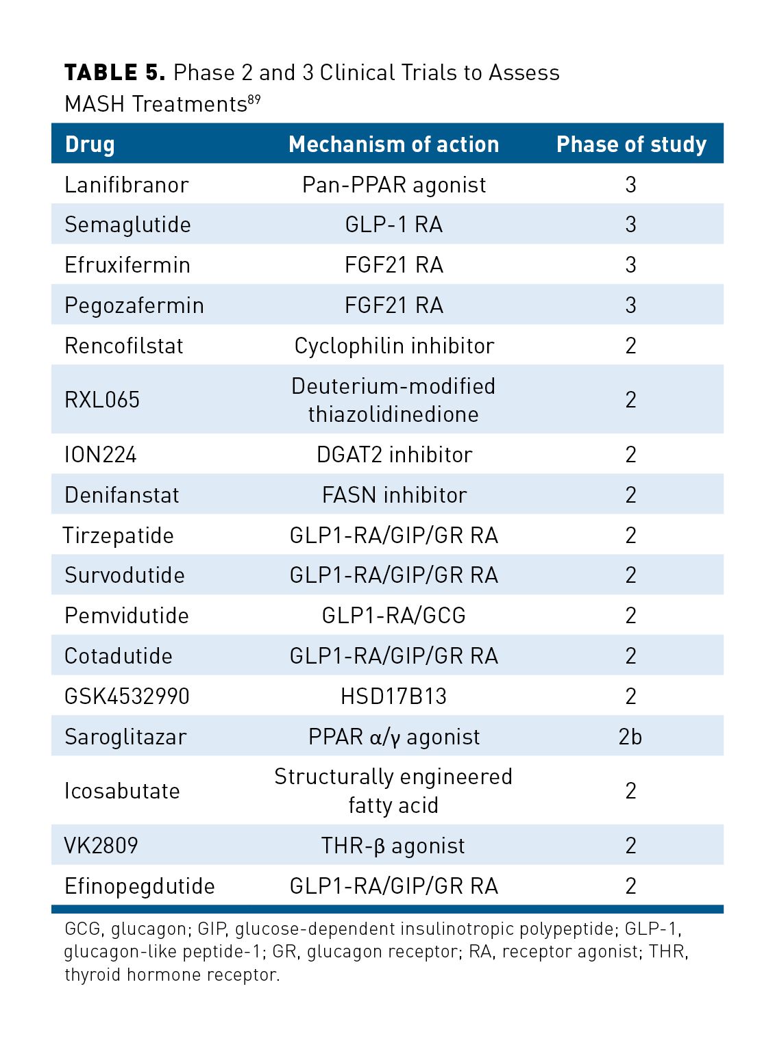 MAESTRO-NASH (NCT03900429) is an ongoing (as of publication) phase 3 trial of adults with biopsy-confirmed MASH and fibrosis stages F1B, F2, or F3.88 Patients were randomly assigned 1:1:1 to receive resmetirom, 80 or 100 mg, or placebo. The 2 primary end points at week 52 were NASH (MASH) resolution that included a reduction in the NAFLD activity score by at least 2 points with no worsening of fibrosis and a reduction in fibrosis by at least 1 stage with no worsening of the MASLD activity score. MASH resolution with no worsening of fibrosis was achieved in 25.9% of the patients in the group given 80 mg of resmetirom, 29.9% of those in the group given 100 mg of resmetirom, and 9.7% of those in the group given placebo (P < .001 for both comparisons with placebo). Fibrosis improvement by at least 1 stage with no worsening of the NAFLD activity score was achieved in 24.2%, 25.9, and 14.2% of patients, respectively (P < .001 for both comparisons with placebo). These data formed the basis of support for the accelerated approval of resmetirom for use in this patient population. The MAESTRONASH study is continuing through 2026.88