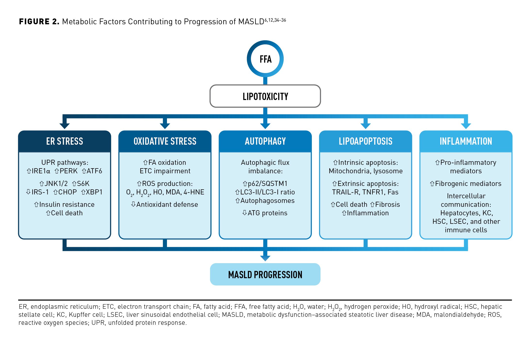 There is an increase in inflammatory cytokines and an accumulation of hepatic triglycerides as dysfunctional adipose tissue causes the release of nonesterified fatty acids.36 This perpetuates a cycle of oxidative stress, further inflammation, and eventual fibrogenesis.6 Endoplasmic reticulum (ER) stress is also a component of lipotoxic liver injury.35 Stress in the ER brings on changes in signaling to a repair response to reestablish homeostasis; however, prolonged ER stress reduces the ability of hepatocytes to restore homeostasis.35 Eventually, prolonged ER stress leads hepatocytes to undergo apoptosis and begins the wound-healing signaling cascade that is hallmarked by inflammation, vascular remodeling, fibrogenesis, and sequestering of immature hepatocytes.27 Kupffer cell cytokine production also contributes to the development of fibrosis in the liver, playing a central role in activating stellate cells to initiate and perpetuate fibrogenesis.37 Further, some individuals may be prone to the development of MASH due to genetic abnormalities, and they may not present with obesity and insulin resistance.6,37 The metabolic factors contributing to the progression of MASLD to MASH are described in Figure 2.6,12,34-36