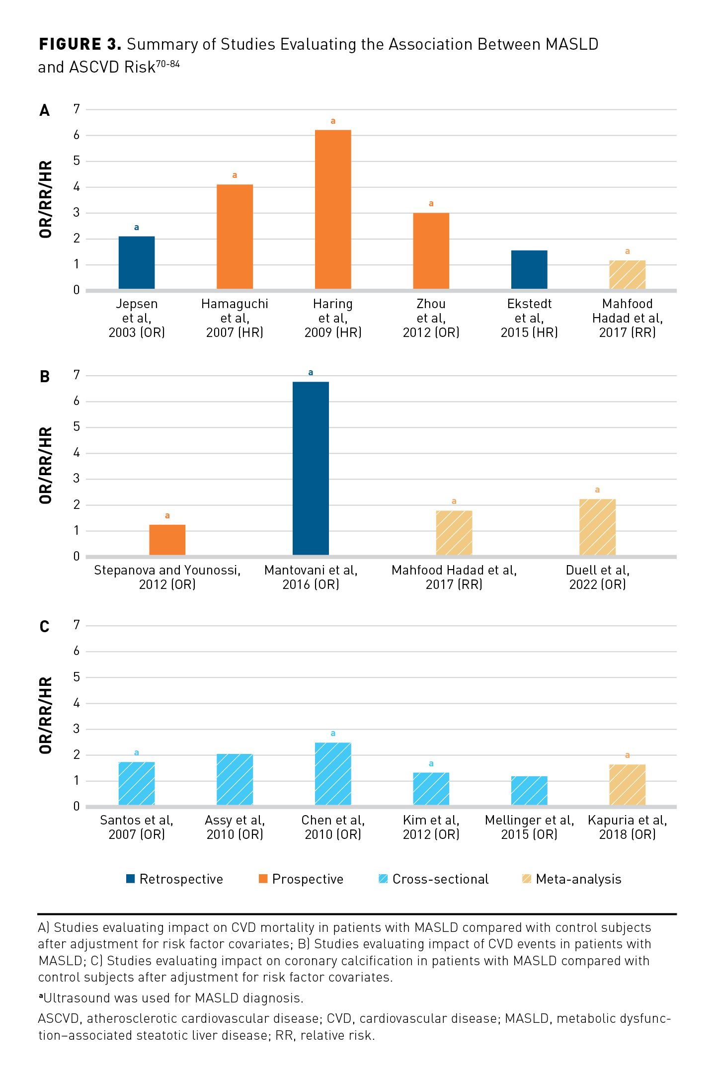 The American Heart Association has issued a scientific statement that includes a summary of study results involving the association between MASLD and ASCVD risk.70 The statement demonstrates that in several trials, MASLD is an underappreciated and independent risk factor for ASCVD even after adjustment for ASCVD risk factor covariates (Figure 3).70-84