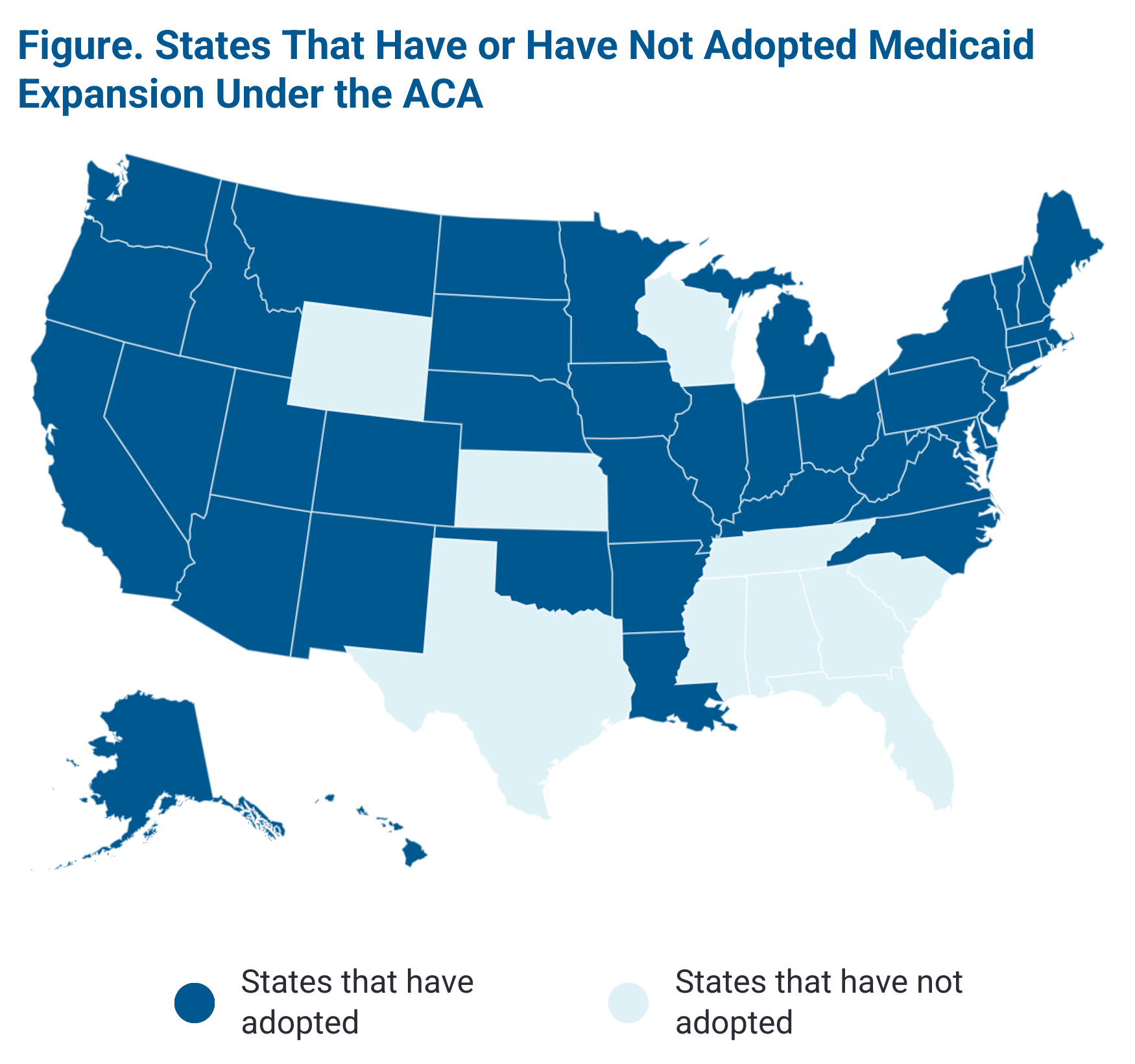 Originally, the ACA aimed to expand Medicaid coverage to nearly all adults with incomes up to 138% of the Federal Poverty Level (FPL) and offered states an enhanced federal matching rate ($21,597 for an individual in 2025).3 However, a 2012 Supreme Court ruling rendered this expansion optional for states. By early 2025, 41 states, including the District of Columbia, had adopted the Medicaid expansion, whereas 10 states had not (Figure).1