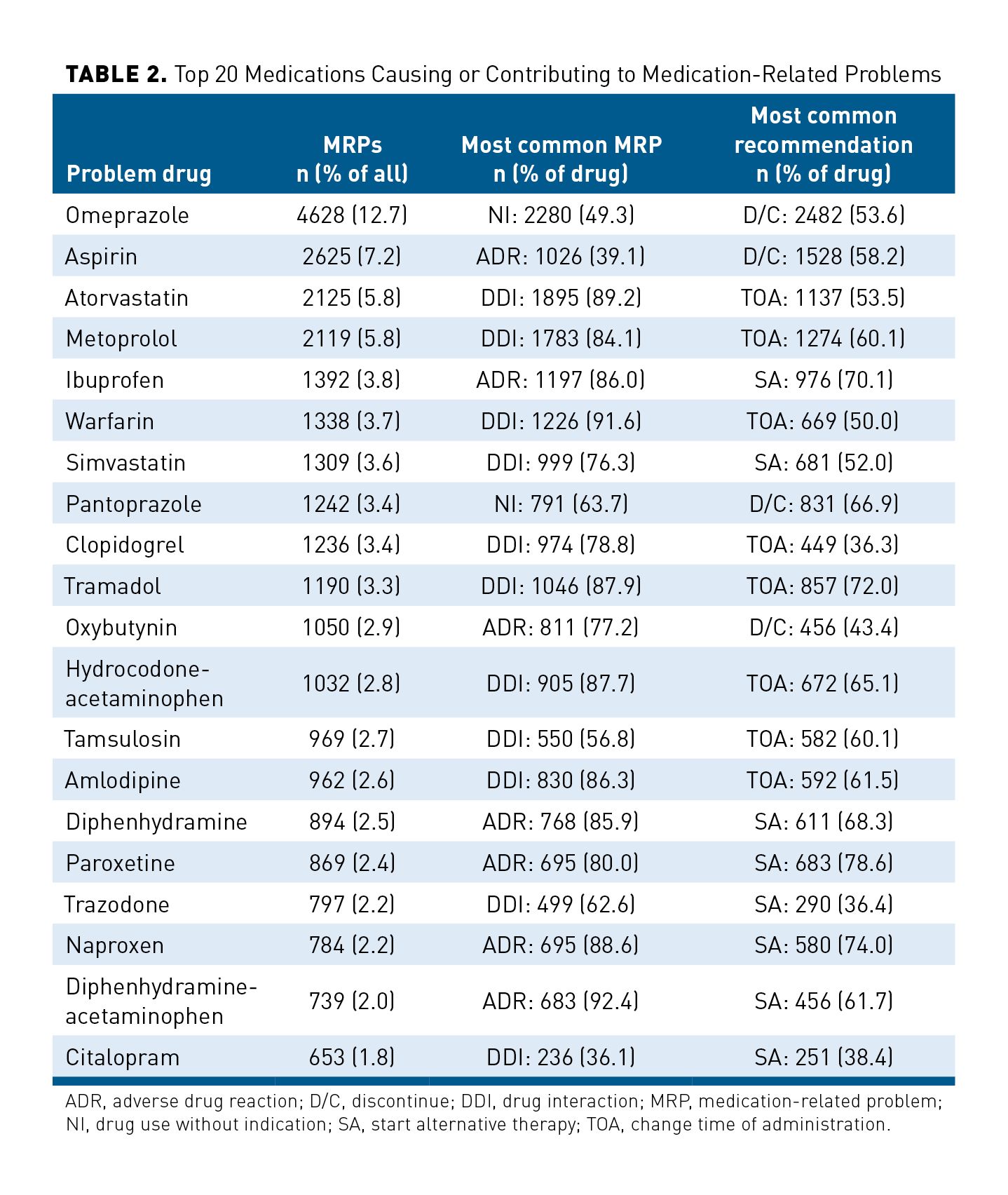 Table 2 reports the top 20 medications that were identified as causing or contributing to MRPs, along with the corresponding most commonly coded MRP and recommendation for resolution. For example, the most commonly identified problem medication was omeprazole, which was coded in 12.7% (4628/36,455) of all MRPs. Pharmacists most frequently found omeprazole not to be indicated (49.3%; 2280/4628) and most frequently recommended to have it discontinued (53.6%; 2482/4628). Pharmacists commonly coded aspirin, ibuprofen, diphenhydramine, diphenhydramine-acetaminophen, oxybutynin, paroxetine, and naproxen with “adverse drug reaction” SNOMED CTs. Furthermore, hydrocodone-acetaminophen, amlodipine, tramadol, warfarin, clopidogrel, simvastatin, atorvastatin, metoprolol, tamsulosin, trazodone, and citalopram were commonly coded with “drug interaction” SNOMED CTs.