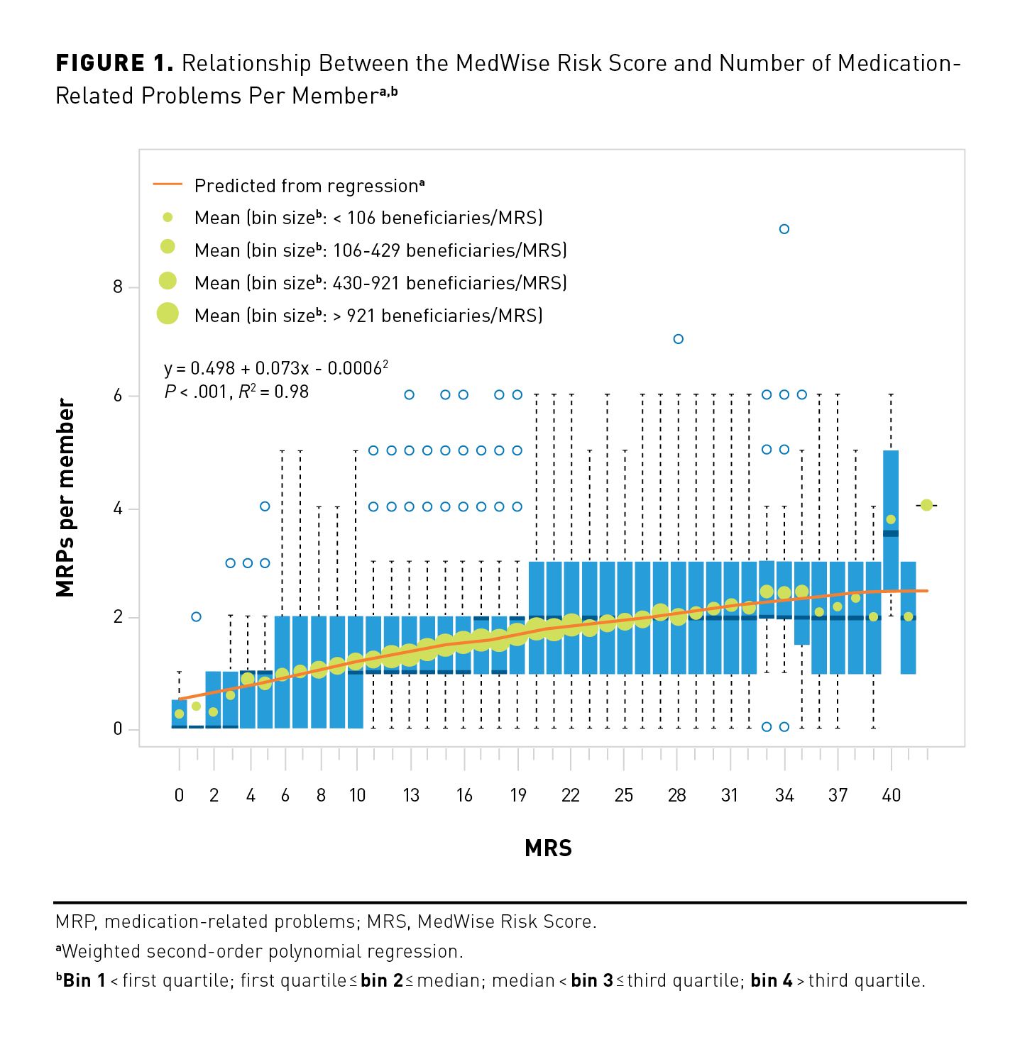 In total, pharmacists identified 36,455 MRPs, corresponding to a mean (SD) number of MRPs of 1.6 (1.1) across the whole population and 1.9 (1.0) for the 18,703 beneficiaries with actionable MRPs. A second-order polynomial regression equation showed that the MRS is positively associated with the number of clinically actionable MRPs identified (Figure 1; MRPs = 0.498 + 0.073 * MRS – 0.0006 * MRS2; adjusted R2 = 0.98, P < .001).