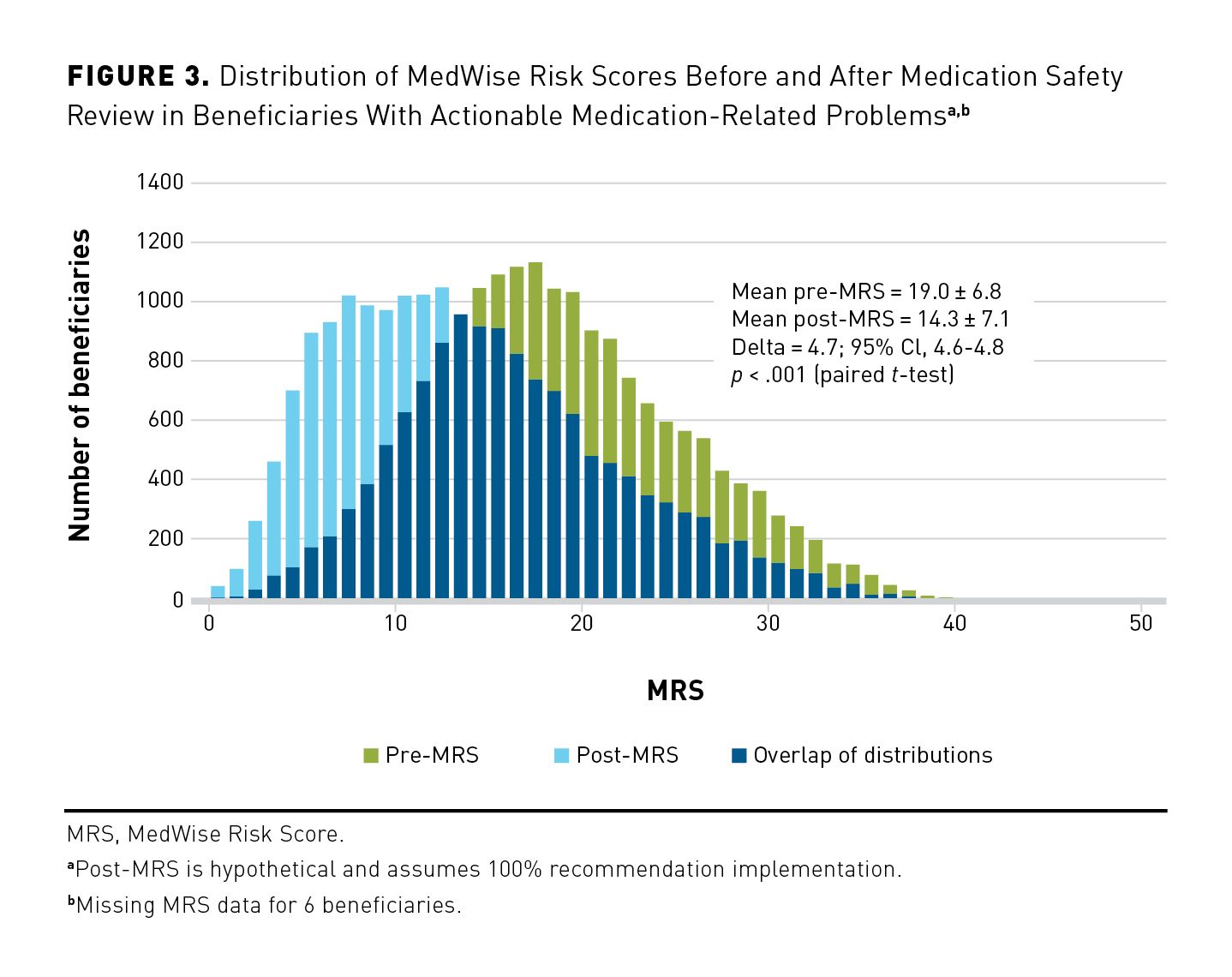 The MRS ranges from 0 to 53, with higher scores representing greater risk of ADEs and other negative health utilization outcomes.6,7 For this analysis, high risk was defined as a score of 20 or higher.6,13 The MRS is based on 5 modifiable risk factors: anticholinergic burden, sedative burden, pharmacokinetic drug interactions, QT prolongation risk, and relative odds of ADEs as computed for the entire medication regimen using primary information obtained from the FDA’s Adverse Event Reporting System database.6,7