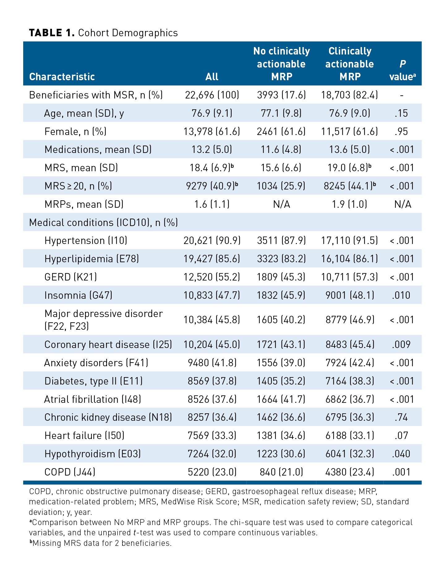 There were 22,696 beneficiaries who received a first-ever MSR for plan years 2018 and 2019. Most beneficiaries (n = 18,703; 82.4%) had at least 1 clinically actionable MRP coded in their MAP and/or PAP (eAppendix Figure 1). Of these, the majority of MSRs (n = 15,643/18,703; 83.6%) were completed by call-center pharmacists, and the rest were completed by community pharmacists. Compared with the 3993 beneficiaries without clinically actionable MRPs, the group with actionable MRPs had a significantly higher mean (SD) MRS (19.0 [6.8] vs 15.6 [6.6]; P < .001), had a significantly greater proportion of high risk (ie, MRS ≥ 20) beneficiaries (44.1% vs 25.9%; P < .001), and took, on average, 2 more medications (mean [SD]:13.6 [5.0] vs 11.6 [4.8]; P < .001). Moreover, several medical conditions were more prevalent among beneficiaries with actionable MRPs. Table 1 reports all demographic details.