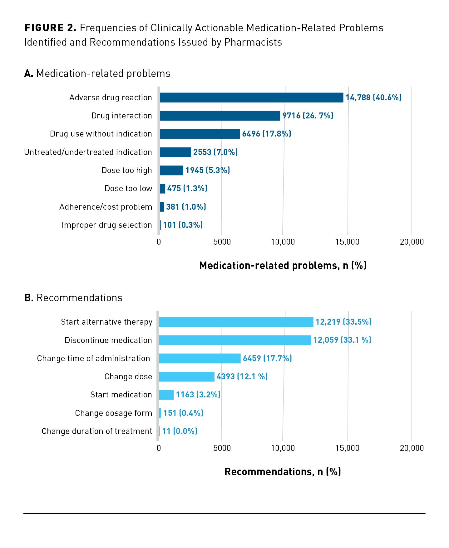 The study has 4 main limitations. First, the distribution of MRPs and recommendations is dependent on pharmacists’ coding consistency and quality. This may be most relevant when a given MRP or recommendation may be coded in 2 different ways. For example, aspirin 81 mg used for primary prevention of cardiovascular disease in a 85-year-old person with low cardiovascular risk could be reasonably documented with “at risk of medication side effect” (ie, bleeding) or “medication therapy unnecessary.”52 Miscoding could also impact the extent to which the MRS can hypothetically change after 100% implementation of recommendations. Extensive and repeated training provided to pharmacists participating in this program and continual verification and validation may have minimized the impact of this limitation. Second, recategorizing SNOMED CT codes into broader and different MRPs and recommendation taxonomies may have inadvertently biased distributions. However, expert opinion used in the recategorization process should have limited such an impact. Third, MedWise cannot account for “composite” recommendations that may influence the interpretation of pharmacists’ activities. For example, if a drug interaction is identified as the MRP, then a pharmacist may provide the doctor with 2 recommendation options to resolve the interactions: (1) discontinuing the perpetrator drug or (2) decreasing the dose of the victim drug. Whereas both options are written as a narrative description within the MAP and/or PAP, the pharmacist would have to pick 1 SNOMED CT recommendation option to code into the action plan. Fourth and finally, this study’s dataset did not capture recommendation implementation. Future studies should capture this intermediate outcome because it can help quantify the feasibility of MSR interventions. Nevertheless, the next article51 in this supplement will show that several utilization outcomes improved in the year following the receipt of a first-ever MSR, indicating that recommendations were feasible by dint of their effectiveness.