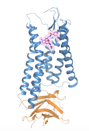 Illustration of the active state kappa opioid receptor bound to a morphine derivative (purple). Credit: Tao Che and Daniel Wacker, Roth Lab, UNC School of Medicine.