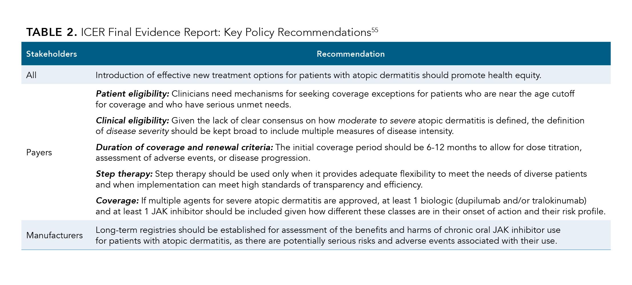 When considering formulary coverage for severe AD, the ICER report recommends that if multiple agents for severe AD are approved, payers include at least 1 biologic and at least 1 JAK inhibitor. This approach recognizes the distinct characteristics of these medication classes including differences in onset of action and risk profiles. The offer of both classes of medications gives patients and health care providers access to diverse treatment options that cater to individual preferences, responses, and safety profiles.57