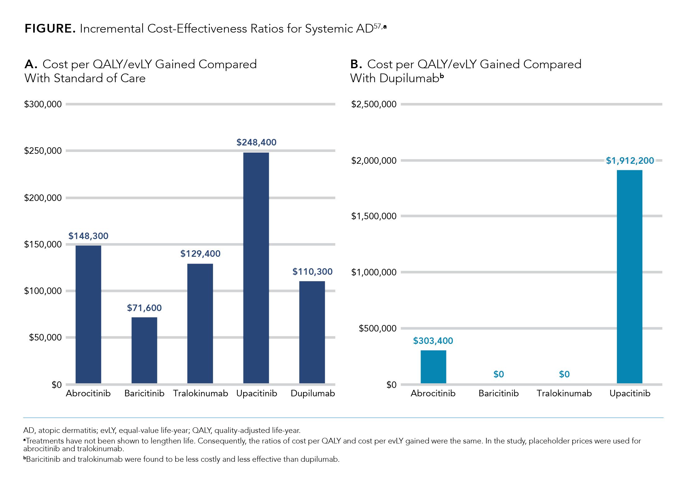 The authors also conducted a cost-effectiveness analysis comparing the oral JAK inhibitors with dupilumab and using placeholder prices for abrocitinib and tralokinumab. This demonstrated that baricitinib and tralokinumab would be less costly and less effective than dupilumab (Figure A).57 As compared with dupilumab, the cost per QALY or equal-value life year gained with use of abrocitinib and upadacitinib would be $303,400 and $1,912,200, respectively (2021 US$) (Figure B).57