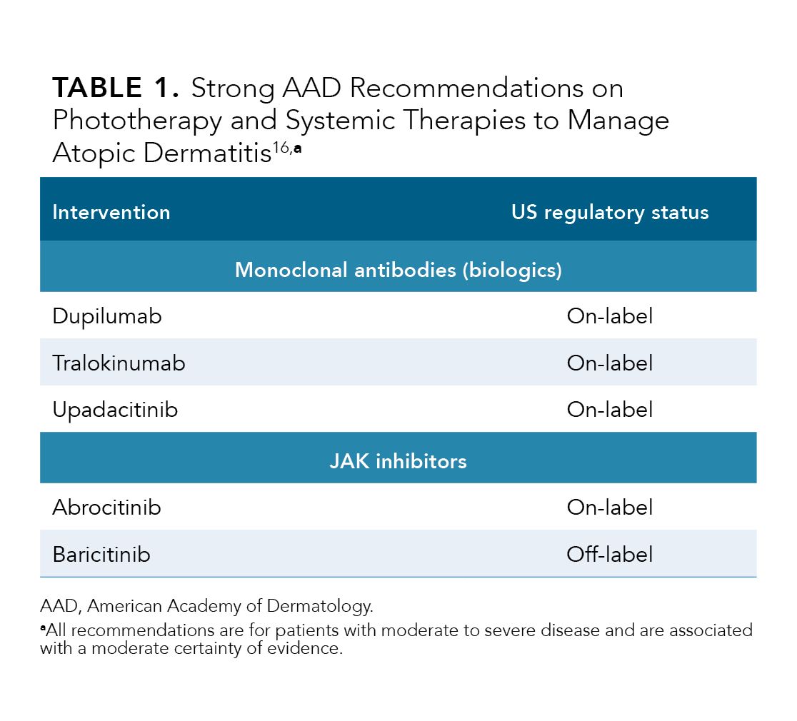 The updated AAD guidelines also provide strong recommendations for the use of systemic JAK inhibitors for the treatment of moderate to severe AD in adults including the on-label usage of upadacitinib and abrocitinib and the off-label usage of baricitinib.16 Upadacitinib and abrocitinib are FDA-approved for patients with moderate to severe AD for whom use of other systemic therapies, such as biologics, has failed to adequately manage disease or when use of other therapies are inadvisable.41,42 Upadacitinib and abrocitinib exhibit preferential targeting of JAK-1.41,42 Baricitinib, a dual JAK-1 and JAK-2 inhibitor, is approved for use in Europe in patients with moderate to severe AD.16,43 Its availability in the US for other immune-mediated conditions underscores its potential as an effective, off-label therapy for AD.16