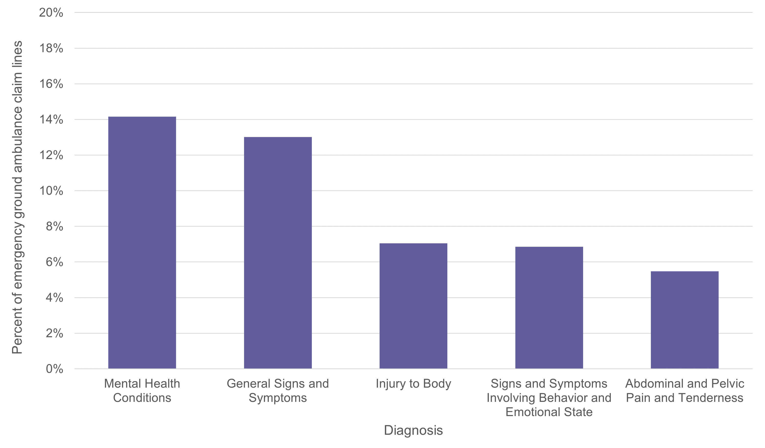 Among patients aged 19-35, mental health conditions were the most common diagnosis associated with emergency ground ambulance in the period 2016-2020 (FIGURE 2).