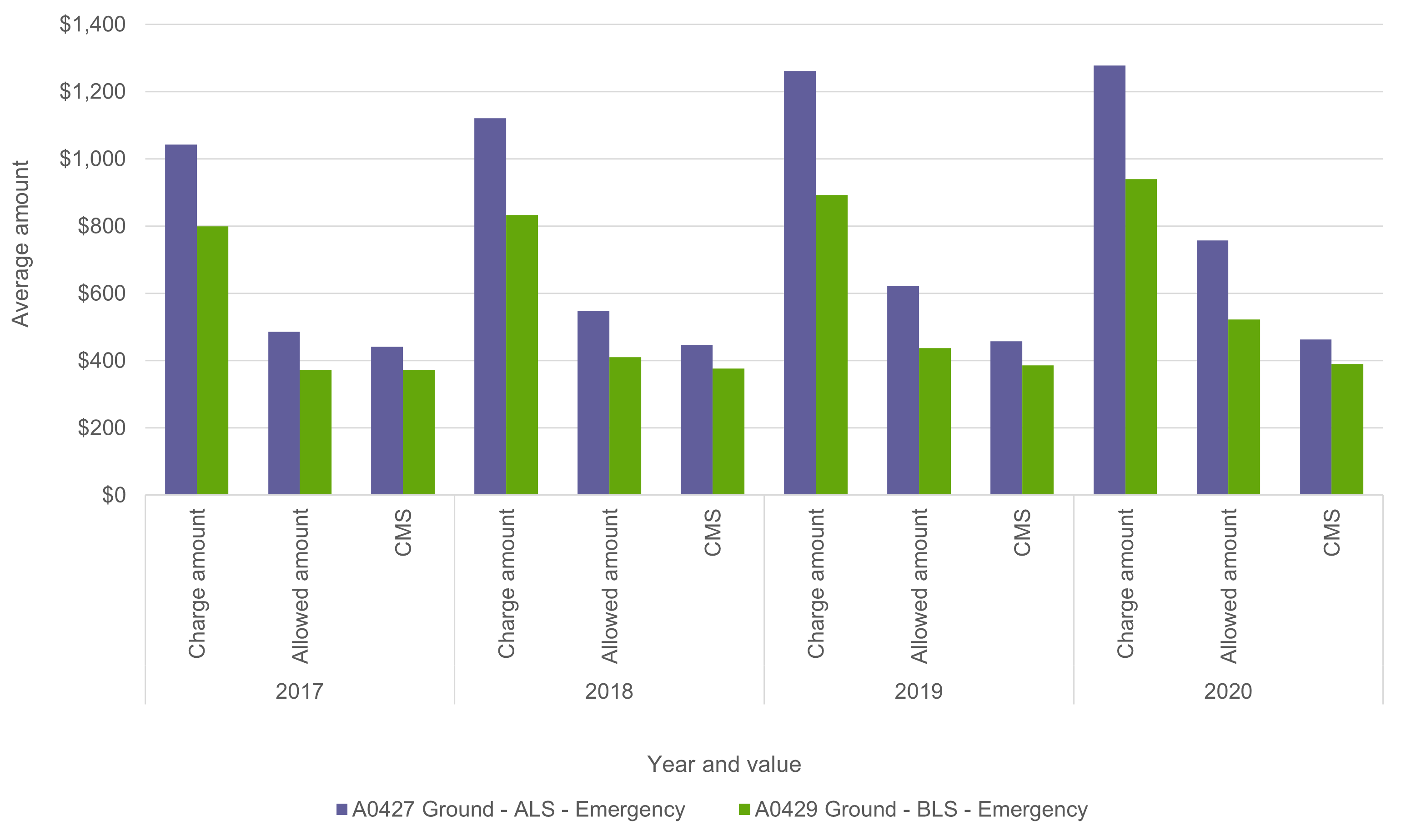 Charges for ALS emergency ground ambulance services increased from an average of $1042 in 2017 to $1277 in 2020—a 22.6% increase. The average charge for BLS emergency ground ambulance services increased 17.5% from $800 in 2017 to $940 in 2020. The average allowed amount for the same services rose 39.9% from $373 to $522 during the same period.