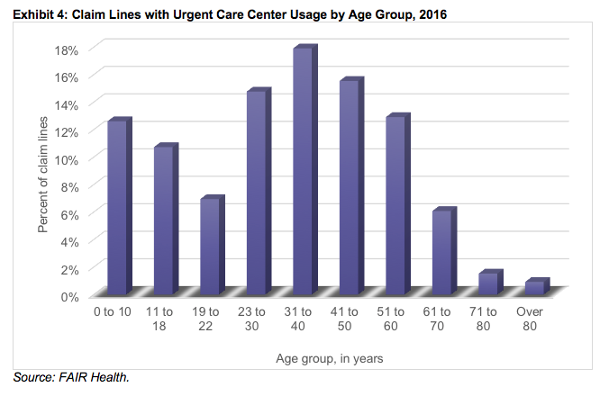 Another area of difference between retail clinics and urgent care centers was in the age groups using them. In 2016, the age span of 31 to 70 years accounted for 72% of the claim lines with retail clinic usage (Exhibit 3), but only 53% of the claim lines with urgent care center usage (Exhibit 4). This was in part because urgent care centers had higher pediatric utilization than retail clinics. Young people aged 0 to 18 years accounted for 24% of urgent care center claim lines, but only 11% of retail clinic claim lines. In addition, the peak age group skewed younger for urgent care centers (31 to 40-year-olds, at 18%) than for retail clinics (51 to 60-year-olds, at 24%).