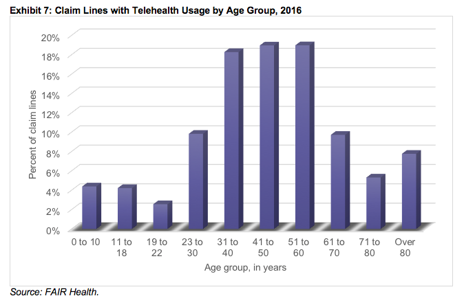 When analyzed by age group, telehealth claim lines (Exhibit 7) were more similar to retail clinic than urgent care center claim lines. In 2016, the age span 31 to 70 years accounted for 66% of the claim lines with telehealth usage—close to the 72% with retail clinic usage. The peak age groups for telehealth were 41 to 50 and 51 to 60 years, each 19%; in retail clinics, the peak age group was 51 to 60 years (24%).