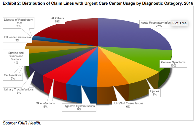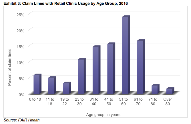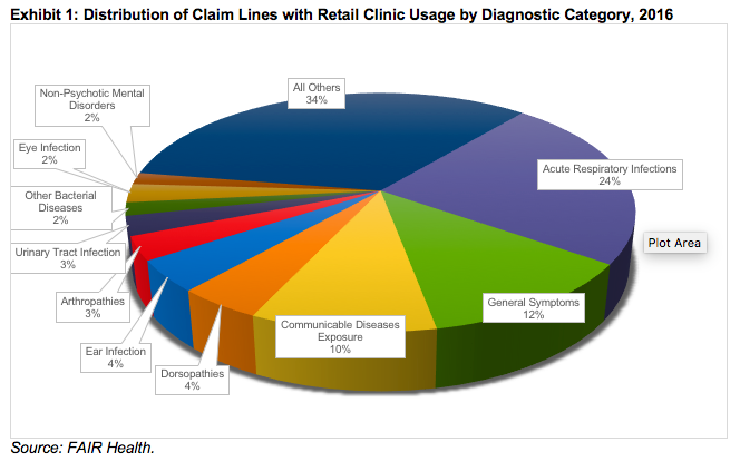 Because they offer convenient hours and do not require an appointment, retail clinics and urgent care centers are often lumped together as “convenient care.” And, it is true that retail clinics, like urgent care centers, have been growing rapidly: From 2011 to 2016, claim lines for retail clinics increased by 847%. But, the 2 places of service are generally regarded as differing in the severity of the conditions they treat. Retail clinics are expected to treat a limited range of minor acute conditions with clear clinical guidelines, such as allergies, ear infections, and sunburn. Urgent care centers, which are usually equipped with their own labs and X-ray machines, can treat more serious acute conditions, including sprains, broken bones, and cuts requiring stitches.