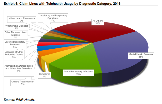 Telehealth differed from both retail clinics and urgent care centers in its most common diagnostic categories. While acute respiratory infections were the most common reason individuals used retail clinics and urgent care centers in 2016, the most common reason for using telehealth that year was mental health issues, which accounted for 31% of telehealth claim lines (Exhibit 6). Acute respiratory infections, at 15%, were the second most common reason for using telehealth.