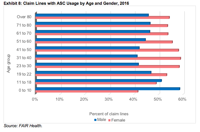 In one respect, ASCs were similar to all the other alternative places of service we studied, as well as to EDs. In every adult age group (ages 19 to 80 years and above), more claim lines for ASCs were submitted for females than males (Exhibit 8). Only in the age span 0 to 18 years were more claim lines submitted for males than females. The same was true in EDs. In retail clinics, urgent care centers and telehealth, females predominated in the age group 11 to 18 years as well as all adult age groups. These results were consistent with the findings of other researchers that females are more likely than males to seek healthcare.