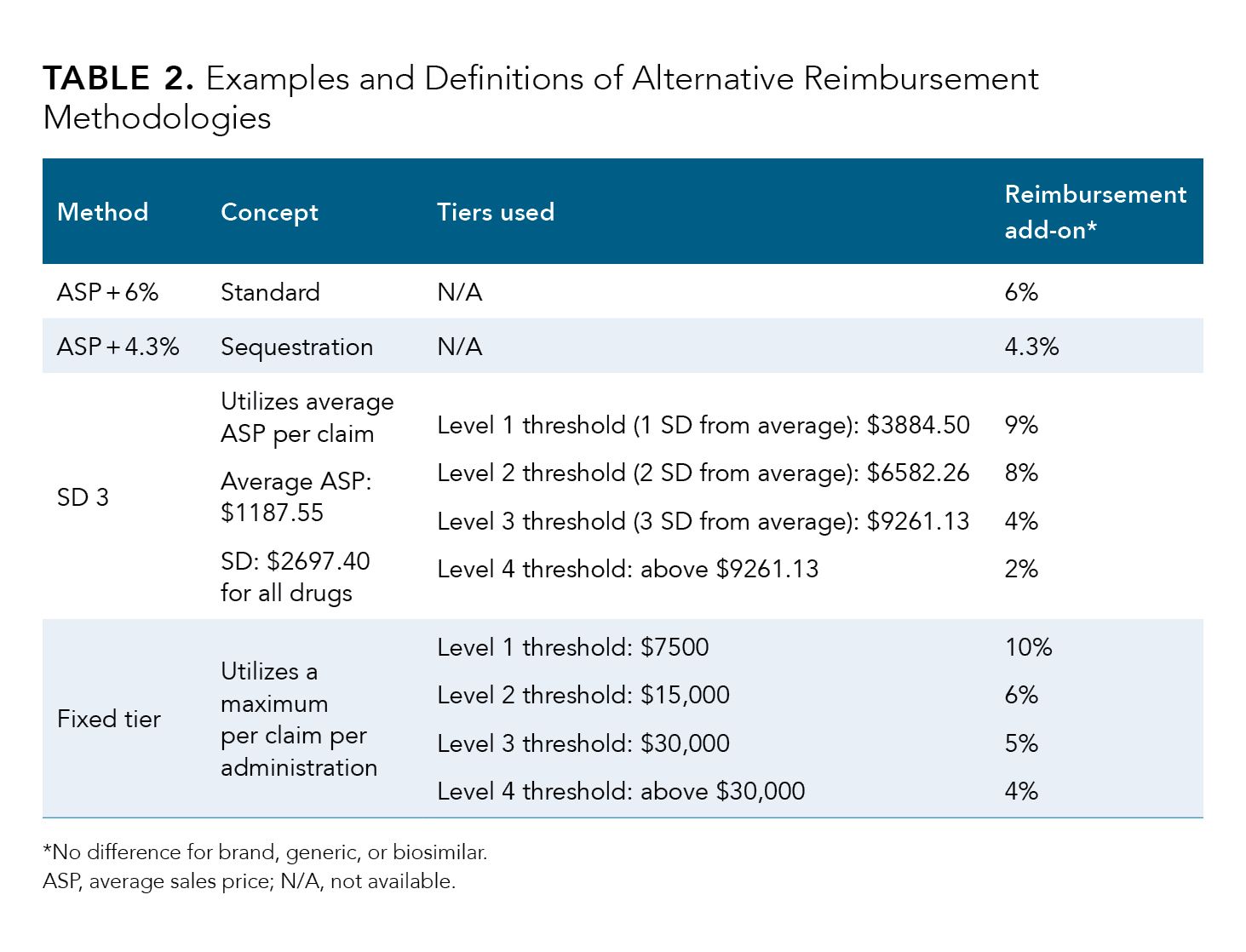 Our research showed that 2 alternative methods, 1 based on tiered reimbursement and 1 on average reimbursement and standard deviation, were able to provide the benefits of ASP 6, provide appropriate reimbursement to various sizes of oncology practices, and curb the growth rate of claims over time. These methodologies provide information for future methods that use ASP as their basis and build upon this construct to provide reasonable rates for payers and sustainability for practices of different sizes, ultimately resulting in optimal patient care.