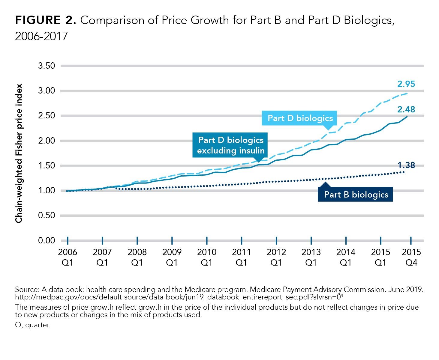 In recent years, drug spending has been increasing rapidly. Between 2005 and 2016, total drug spending grew at an average rate of 7.4%, with slower growth from 2005 to 2009 (3.7% per year) and more rapid growth from 2009 to 2016 (9.5% per year). This drugs, including the adoption of new, higher-priced drugs.4 However, the price growth from 2006 to 2015 (Figure 2) for Part B was still lower than that of Part D, in part due to ASP reimbursement methodology.