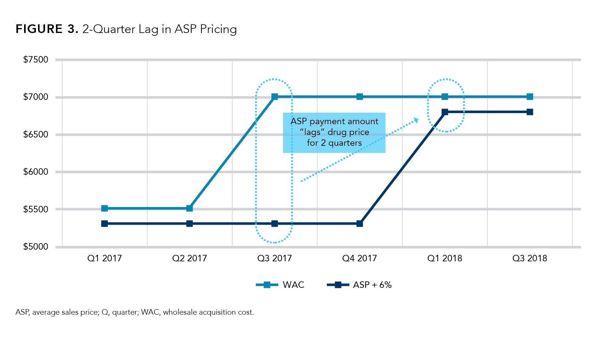 This scenario is illustrated in Figure 3, which shows the impact of the 2-quarter lag on ASP reimbursement in a simplified version with an example drug. The WAC of the drug in Q1 2017 has been stable at $5500 and ASP-based reimbursement has also been stable at $5300. In Q3 of 2017, the example drug’s price increases to $7000 (as shown in the large red circle). Due to the 2-quarter lag in ASP-based reimbursement changes, the ASP 6 reimbursement does not “catch up” to the WAC until 2 quarters later in Q1 2018 (as shown in the smaller red circle). The risk of this scenario creates a natural inhibition to price increases for drugs dependent on Part B that is not easily overridden by manufacturers without rendering products commercially inviable.30