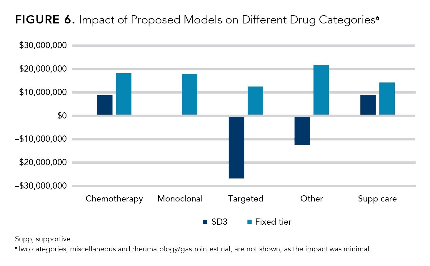 The reimbursement based on the proposed methodologies for 2019 is shown in Figure 5. Both the SD 3 and fixed tier methods are at or slightly above ASP 6. Each model aff ected drug categories differently relative to ASP 6. The SD 3 model had the largest effect on the targeted therapy category, which represents some of the greatest costs of oncology care; the effect of the fixed tier model on these categories distributed the add-on to incentivize the use of lower-cost drugs, such as chemotherapy and supportive care. The effects of fixed tier and SD 3 models relative to ASP 6 are shown in Figure 6.