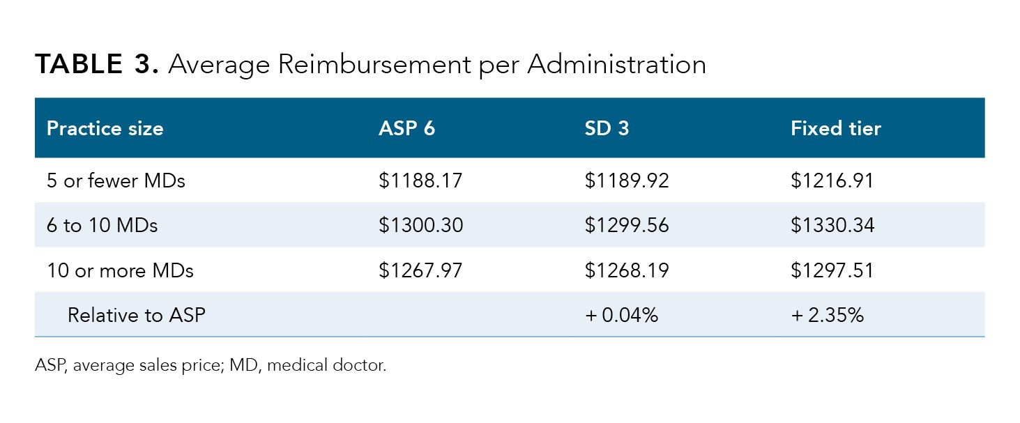 Practice settings were divided into 3 sizes: those with 5 or fewer medical doctors (MDs), those with 6 to 10 MDs, and those with 10 or more MDs. The models affected each practice size differently. The fixed tier and SD 3 models generated results similar to ASP 6. The average reimbursement per administration is shown in Table 3.