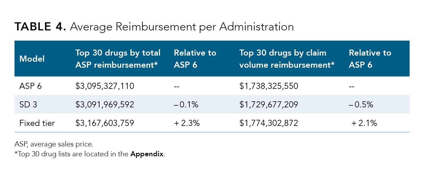 The methods we present here include ASP 6, ASP 4.3, and 2 alternative ones labeled “SD 3” (standard deviation) and “Fixed Tier.” The fixed tier method assigned tiers based on the maximum reimbursement per administration of a drug; the reimbursement add-on fee was dependent upon the claim’s tier. Similarly, the SD 3 method established thresholds utilizing the average ASP per administration claim and then considered standard deviations from that average. Depending on how many standard deviations from average, the claim was determined the thresholds applied and the reimbursement add-on. Details for these models are further illustrated in Table 2. Other tiered or capped models were evaluated but are not presented due to their failure to provide the