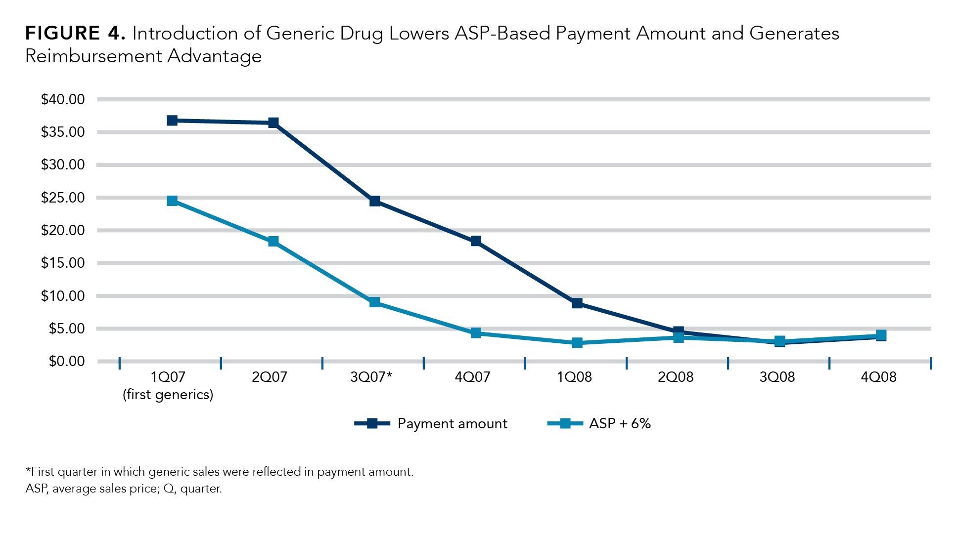 ASP METHODOLOGY ENGENDERS LOWER GENERIC DRUG PRICING RELATIVE TO BRAND INNOVATORS. Price increases are not immediately reflected in the ASP reimbursement, but price decreases, such as occur when a generic enters the market, are immediately apparent in a provider’s acquisition cost.30 Providers can then realize a potential increase in the actual reimbursement over acquisition cost proportionate to the price decrease enacted during the 6-month lag period.