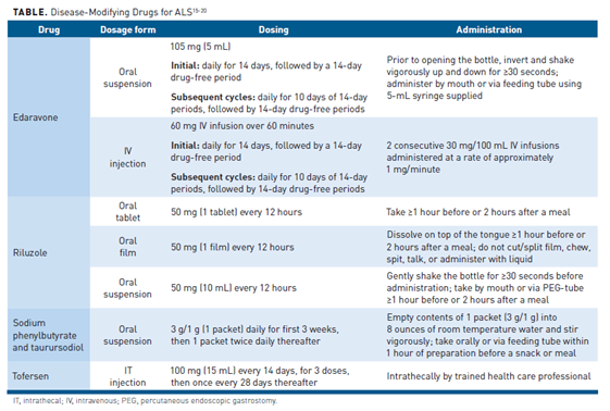 Clinical trials have studied many experimental drugs to slow ALS progression in animal models with promising results, though few have translated to efficacy in humans with the disease.14 Three therapies are currently approved by the U.S. Food and Drug Administration (FDA) to slow disease progression in ALS, and these are riluzole, edaravone, sodium phenylbutyrate and taurursodiol (PB/TURSO). Tofersen, a fourth therapy, was approved under an accelerated approval. The Table15-20 lists appropriate dosing and administration for these disease-modifying therapies.