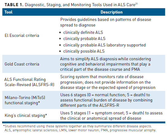 ALS diagnosis is based primarily on clinical signs and symptoms and exclusion of other causes for LMN and UMN dysfunction.17,21 Clinicians most commonly use the El Escorial criteria to diagnose ALS based on 3 factors17: