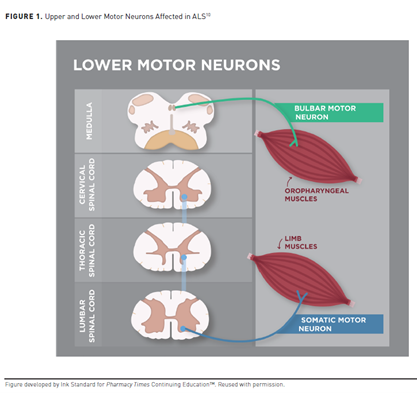 A quote from the novel Tuesdays with Morrie: An Old Man, a Young Man, and Life’s Greatest Lesson, summarizes the burden of ALS: “ALS is like a lit candle: it melts your nerves and leaves your body a pile of wax. You cannot support yourself standing. You cannot sit up straight. By the end, if you are still alive, your soul, perfectly awake, is imprisoned inside a limp husk. Like something from a science fiction movie, the man frozen inside his own flesh.”31 Pharmacists should appreciate the burden that this disease inflicts on patients and caregivers and the need for accurate and timely diagnosis and treatment. Understanding the variability and differing phenotypes in ALS as well as increasing familiarity with biomarkers can support definitive diagnoses of ALS in patients, in turn, leading to downstream effects of positively impacting patient QOL and survival.