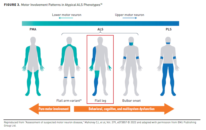 Patients with signs and symptoms of motor neuron dysfunction who do not meet true diagnostic criteria for ALS may have a related form of motor neuron disease. Atypical forms of ALS include cases with better prognosis or pure UMN or LMN involvement. These clinical phenotypes can be classified based on the level and anatomical area of motor neuron involvement and pattern of onset (see Figure 3).18 These interrelated entities and clinical syndromes usually, but not always, evolve into ALS.18