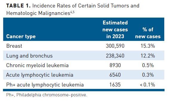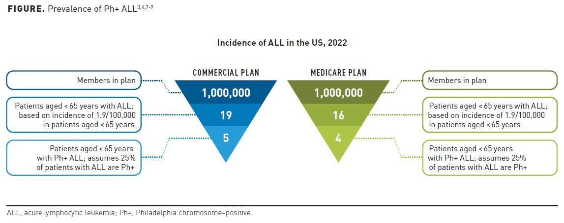 In ALL, a hematologic cancer affecting more than 6000 new patients per year, the age-adjusted incidence rate is 1.8 per 100,000 men and women per year (Table 1).3-5 Philadelphia chromosome-positive (Ph+) ALL is characterized by the BCR:ABL fusion, found in approximately 25% of patients with ALL and representing the most common cytogenetic abnormality in adult ALL.5,6 In a 1 million–member health plan, payers would expect to see approximately 4.5 new cases of Ph+ ALL per year (Figure).3,4,6-9