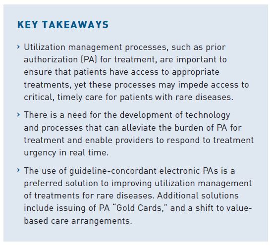 The purpose of utilization management is to help health care systems and payers manage costs and reduce waste while ensuring that patients get medically appropriate care in the correct setting. Yet some utilization management processes, such as PAs, can create barriers to access for patients. There is a need for the development of technology and processes that alleviate provider burden. Such goals may be achievable through the enhancement of the PA process, the use of ePAs to expedite patient care initiation, the adoption of a platform that offers interoperability with EHR systems, and the enhanced ability to share data to expedite authorizations and support utilization and cost analyses. Additional utilization management tools and processes are needed to aid in the treatment of rare diseases, where peer-reviewed and real-world data tend to be more finite.