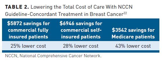 Recently published studies have examined the relative quality and cost-effectiveness of guideline-concordant and nonconcordant treatment. The results of a retrospective database study of over 300 patients with breast cancer showed over 40% savings in the total costs of care (TCOC) per member, per month (PMPM) when guideline-concordant treatment is utilized in Medicare populations (Table 2).22 Differences were evident in provider chemotherapy spend and outpatient spend.